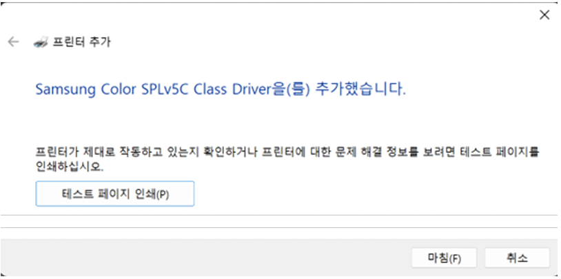 이제 완료되어서 마침을 누르면 되는데, 그 전에 테스트 페이지 인쇄를 클릭해서 테스트페이지를 한번 봐주세요. 어짜피 연결되었는지 확인하려면 테스트 페이지 한번 출력할거잖아요?