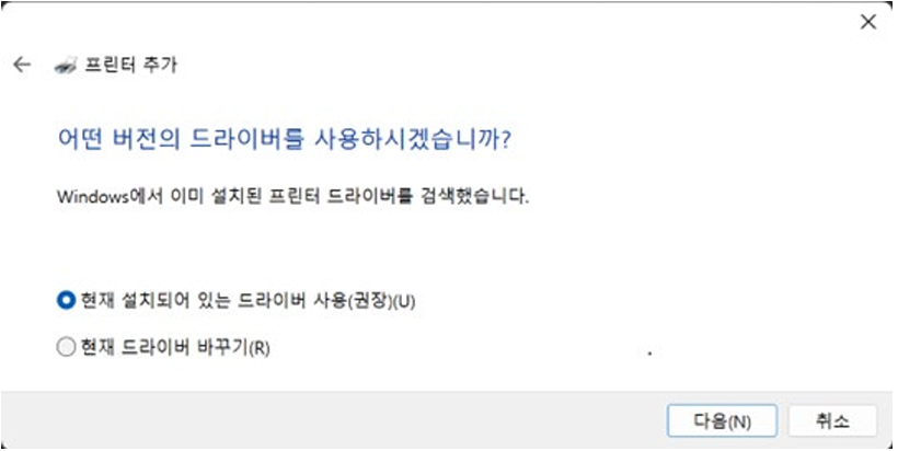 윈도우 11 드라이버가 기본적으로 잘 되어 있어서 드라이버 설치가 되어 있을수 있어요. 그렇다면 그냥 현재 설치되어 있는 드라이버 사용(권장)을 누르시고 다음 하시면 되요.