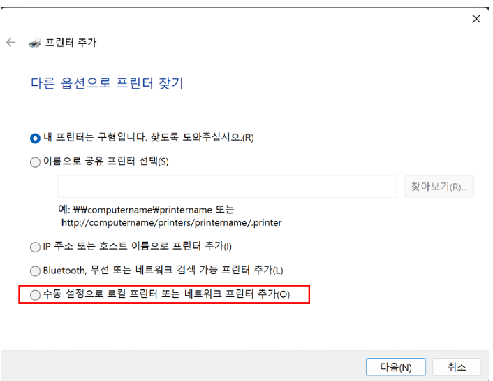 4) 프린터 추가 → 수동 설정으로 로컬 프린터 또는 네트워크 프린터 추가