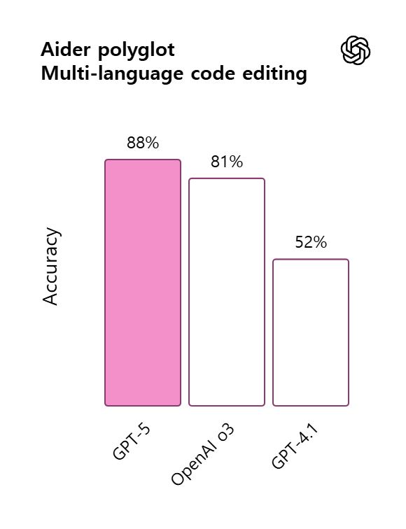 - SWE-bench Verified: GPT-5가 74.9%(Thinking 켜짐)로 내부/타 모델 대비 우세.